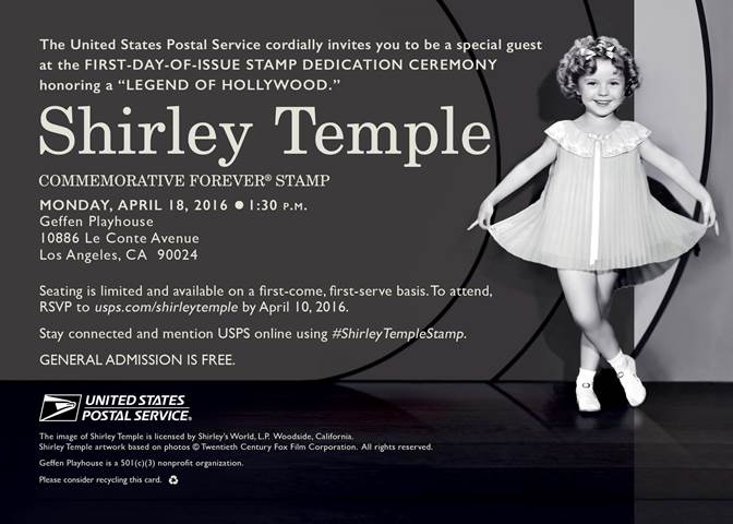 Image above of Shirley Temple stamp – U.S. Postal Service Stamp Services – Stamp Announcement 16-11: Shirley Temple Stamp @USPSStamps @USPS