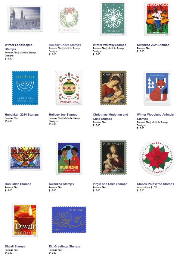 Speaking of current postage rates, here is a screenshot of the 2025 Holiday Stamps I’m seeing at the USPS Postal Store.